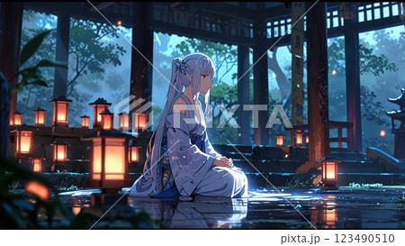 ライトアップされた夜の神社の鳥居と着物の女性
