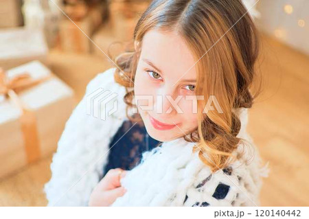 teenage girl in a dress near an unconventional Christmas tree surrounded by golden lights
