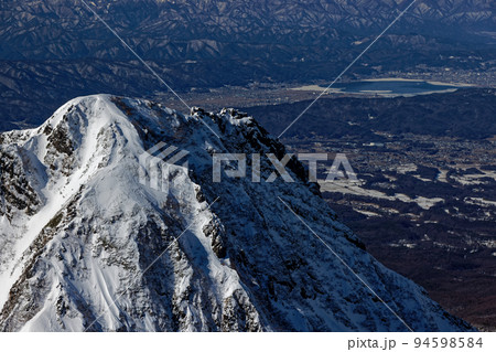 八ヶ岳連峰・赤岳山頂から見る阿弥陀岳と諏訪湖