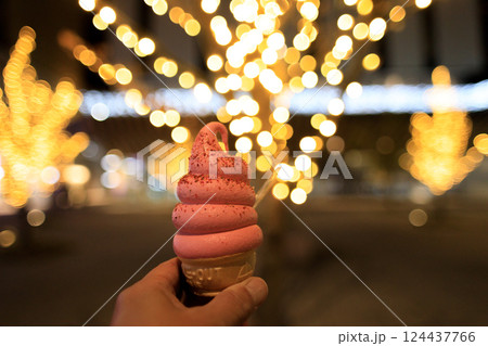 寒い冬にイルミネーションを見ながら食べる栃木のあまおうソフト