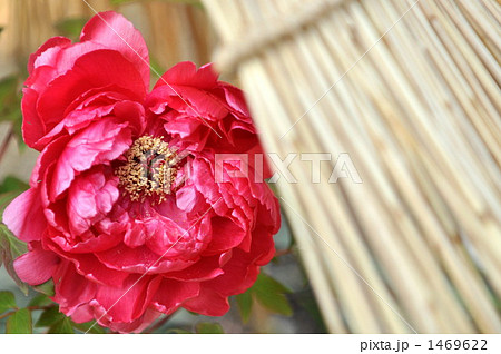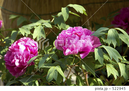 冬の風物詩藁囲いの中で咲く大輪のピンクの牡丹の花
