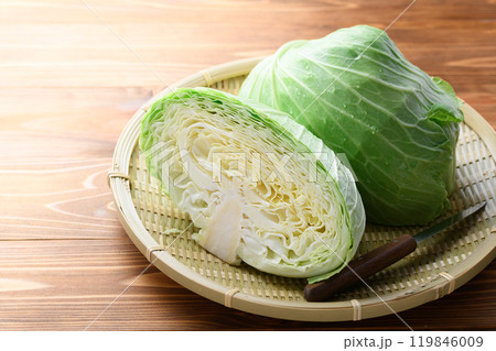 新鮮なキャベツ カットイメージ ( 木目背景 )