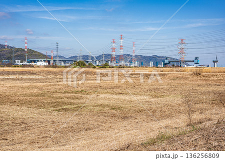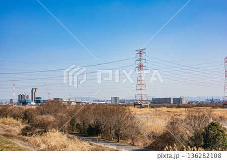 淀川右岸河川敷に立つ送電線鉄塔 大阪府高槻市