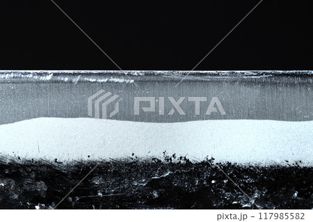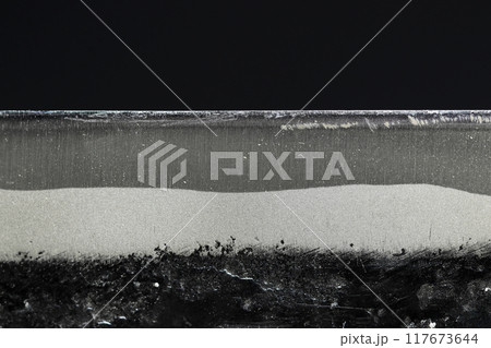 日本の伝統鍛冶打刃物・青銅の刃先と刃境、縞筋模様を水平に撮影した黒背景画像素材。