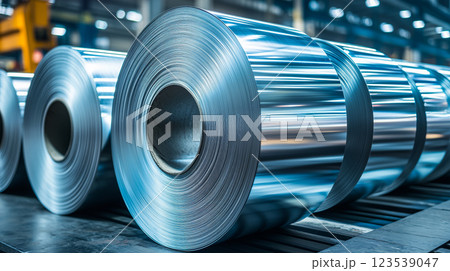 未来的な金属圧延工場。反射性の高い大型アルミロールを展示