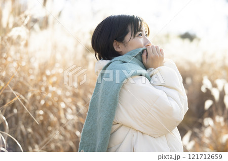 女性 マフラー 屋外 冬 風邪 寒い 咳 くしゃみ