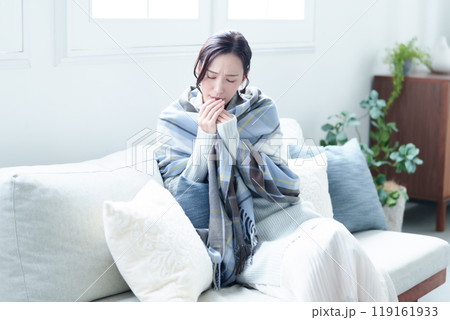冬の部屋で寒がるミドル〜シニア女性