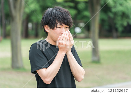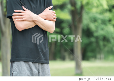 トレーニング中に汗冷えした男性(寒い・薄着・冷え)疲労, 寒い, 汗冷え, 冷える, スポーツ, 運