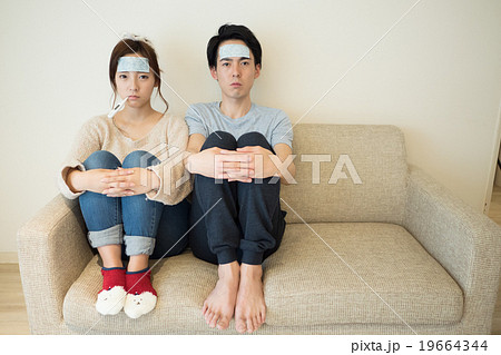 体温計で体温を測る体調不良の日本人女性(発熱・高熱・冷却シート)