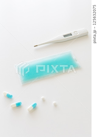 体温計と冷却シートを白背景で撮影