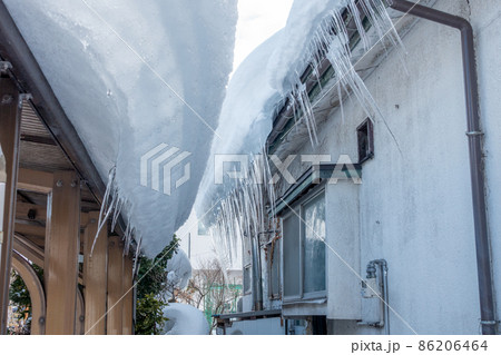 屋根の軒先から垂れ下がる氷柱 つらら 雪国