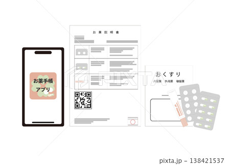 処方された薬と薬の説明書とお薬手帳アプリのイラスト