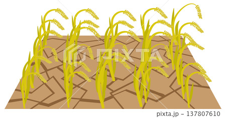 水不足によって田んぼがひび割れして稲穂がしおれてしまっているイメージ素材