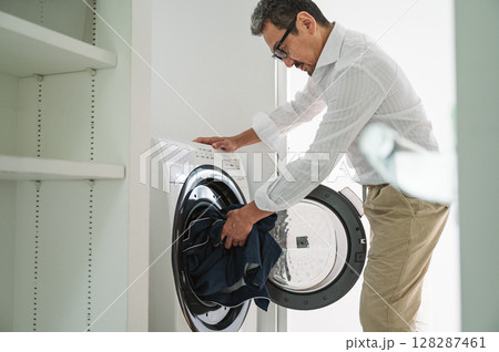 ドラム式洗濯機で服を洗う50代のミドル男性