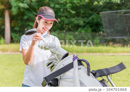 ゴルフ場でゴルフバッグにドライバーを入れる女性ゴルファー