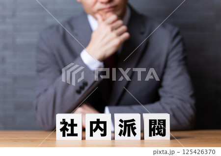 社内派閥のブロックとスーツを着て悩むミドル男性ビジネスマン