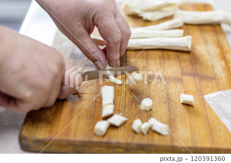 Medium close up of unrecognizable male chef hands slicing mozzarella on wooden cut board