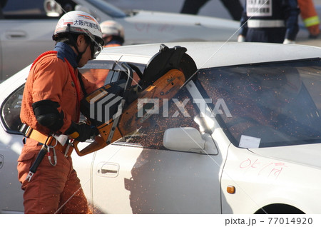 エンジンカッターを使用した、車両閉じ込め救助の展示(防災訓練)