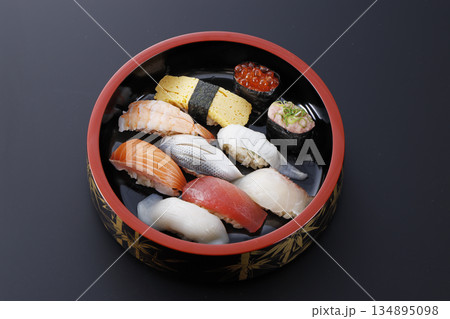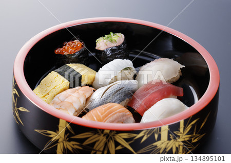 伝統的な寿司桶に盛り付けられた江戸前握り寿司一人前