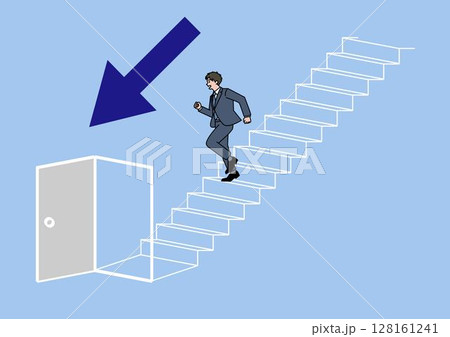 扉の開いた階段を下りる男性と下向き矢印