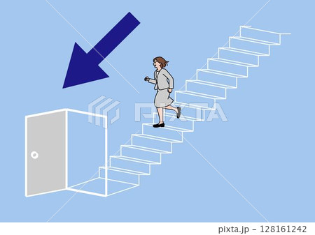 扉の開いた階段を下りる女性と下向き矢印