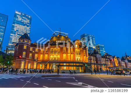 日本の東京都市景観 東京駅丸の内北口。仕事などを終えて駅に向かう人たち