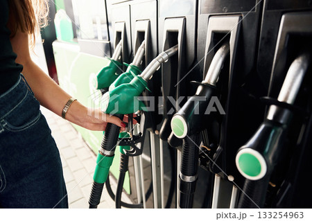 Focused detailed close up view. Young woman on the gas station