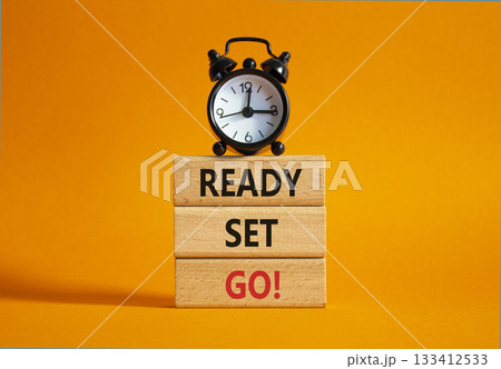 Ready Set Go symbol. Concept words Ready Set Go on wooden blocks. Beautiful orange background with alarm clock. Business and Ready Set Go concept. Copy space.