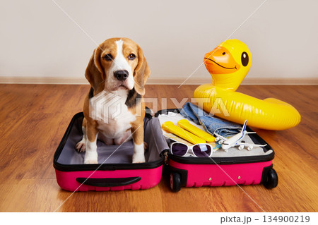 A cute beagle dog at a suitcase with things and items for a summer vacation