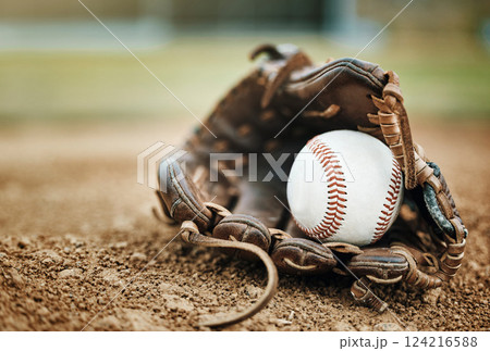 Baseball, leather glove and ball on pitch sand after fitness, workout or training for match or competition. Zoom, texture and softball mitt on field for sports team, wellness exercise or stadium game