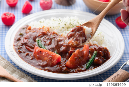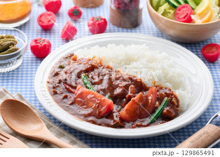 ほかほかと香り立つトマトカレーと白ごはんの盛り付け サラダ付き家庭料理の食卓イメージ
