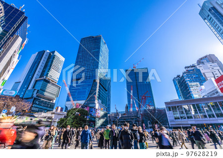 日本の東京都市景観 元日。屋外等マスク不要。換気不足…全窓を閉めた満員電車…感染爆発は必然=渋谷