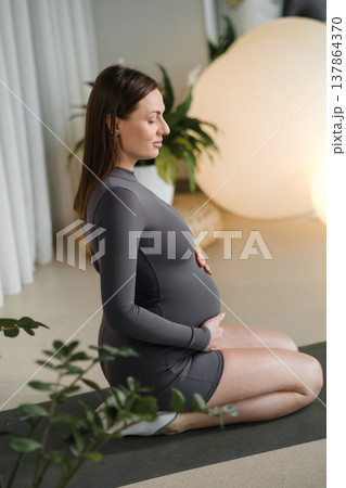 Pregnant woman sitting on yoga mat at home and touching belly