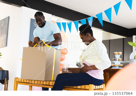 Couple celebrating baby shower, man opening gift box while woman smiles joyfully