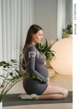 Pregnant woman in yoga pose performing meditation indoors during morning light in a calm space