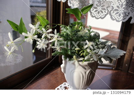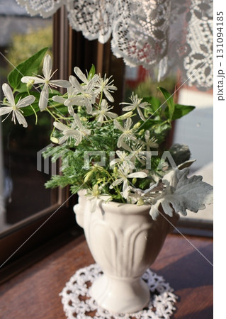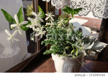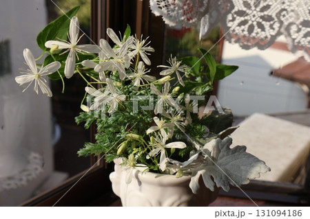 窓辺に飾られた白い小花のセンニンソウ