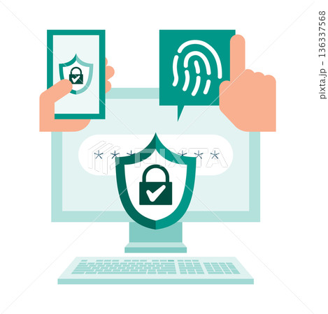 指紋認証とスマホ二段階認証でPCログインするセキュリティイラスト