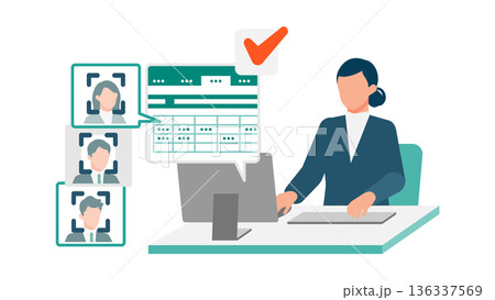 顔認証データをエクセルで管理する女性社員の勤怠管理イラスト