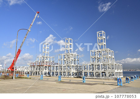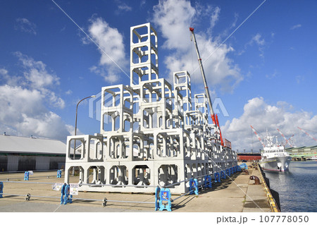 秋の北海道函館市函館港西ふ頭でコンクリート製の漁礁の製作現場を撮影
