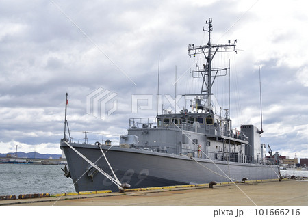 春の北海道函館市函館港西ふ頭に停泊中の海上自衛隊の艦船の風景を撮影