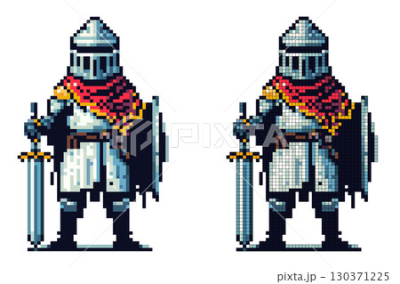 A pixel art knight stands confidently, holding a sword and shield. Clad in armor with a cloak, the warrior prepares for an adventure in a fantasy landscape