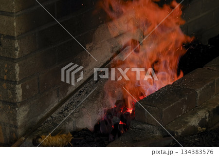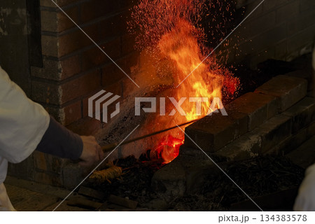 日本独自の鍛錬方法で作られる日本刀を鍛えている鍛冶屋の職人を撮影
