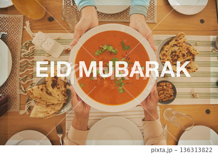 Food, Eid Mubarak and soup for family at table for Islamic celebration, festival and lunch together. Ramadan, religion and above of hands with meal, dish and cuisine for fasting, holiday and culture