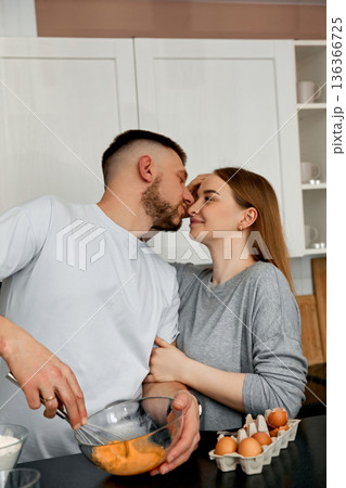 Couple enjoys cooking together in a modern kitchen during the afternoon, mixing ingredients while sharing a moment of closeness and joy