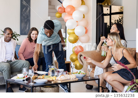 Celebration with friends enjoying food, drinks, and laughter at a lively house party. Perfect for themes of joy