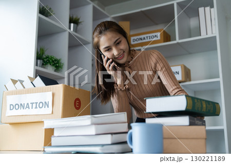Young Woman Organizing Donation Boxes with Books and Supplies in a Modern Office Setting