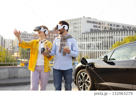 A couple wearing VR headsets while their electric car charges, showcasing a futuristic lifestyle.