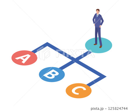 二股に分かれた分岐路に出くわしている若い男性のアイソメトリックイラスト