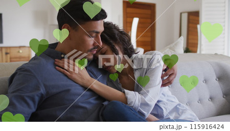 Image of heart icons over biracial couple embracing