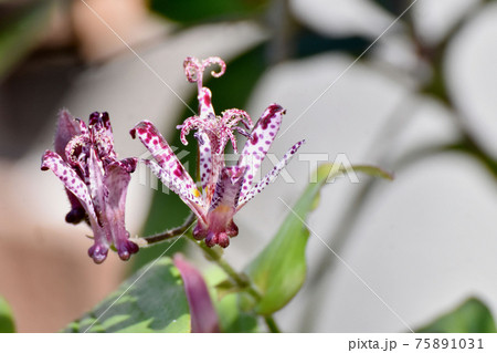 三鷹市中原に咲く白と赤紫色のホトトギスの花